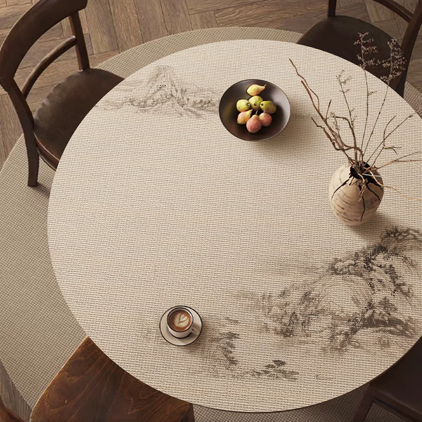 新中式水墨画デザインのレザー製防水・防油ラウンドテーブルマット - 高級感溢れるおしゃれな茶卓カバー、汚れに強くお手入れ不要!